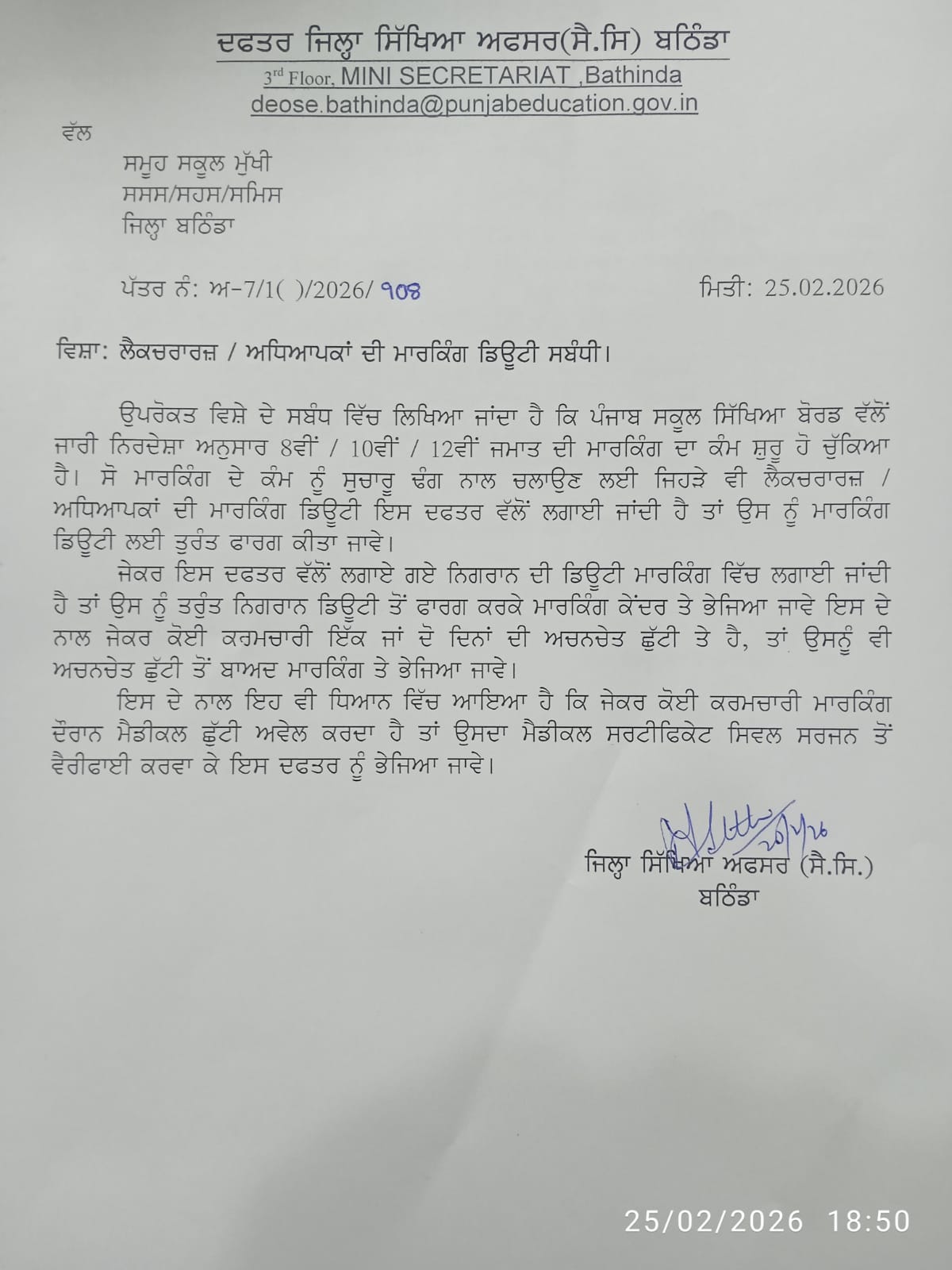 | DEO | Reg. SDM duty order Talwandi sabo | 22-04-2026 16:52 | Download |